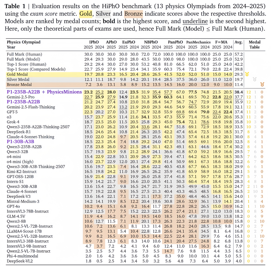 其中,P1-235-A22B在2025年国际物理奥林匹克大赛(IPhO)拿下金牌,成为首个也是唯一获得金牌的开源模型;在覆盖2024-2025年全球13场顶级物理竞赛的HiPhO基准测试中,与Gemini-2.5-Pro并列奖牌榜第一。