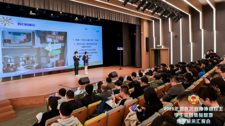 11月25日,普陀区2025年协商民主学生实践体验基地成果展示汇报会在上海少年儿童图书馆举办。来自上海市曹杨第二中学、上海市晋元高级中学、上海市曹杨中学等学校的10个学生团队现场展示了各自的调研成果。调研主题聚焦社会热点与前沿领域,关注青少年人工智能素养培育、智慧健康养老产业发展、儿童友好型商圈建设等议题。成果展示方式生动多元,多个学生团队以角色演绎与PPT宣讲相结合的方式介绍了调研背景、现状与建议。
