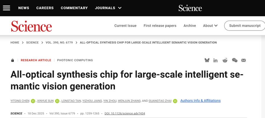 论文同步被《科学》杂志选为高光论文重点报道。文中提到,生成式AI正加速融入生产生活,要让“下一代算力芯片”在现代人工智能社会中真正实用,势在必行的是研发能够直接执行真实世界所需前沿任务的芯片——尤其是大规模生成模型这类对端到端时延与能耗极高的任务。面向这一目标,LightGen为新一代算力芯片真正助力前沿人工智能开辟了新路径,也为探索更高速、更高能效的生成式智能计算提供了新的研究方向。