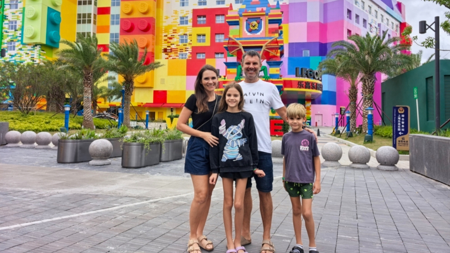 亚当一家四口在上海乐高乐园酒店前留影。 李宝花 摄
